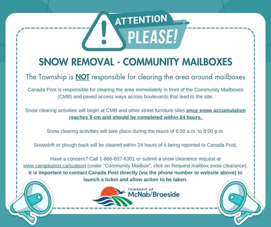 If you have a concern about your community mailbox, it is important to contact Canada Post directly so that proper action can be taken by calling 1-866-607-6301 or by visiting https://www.canadapost-postescanada.ca/information/app/ccm/personal/create?execution=e1s1 and submitting a snow clearance request.