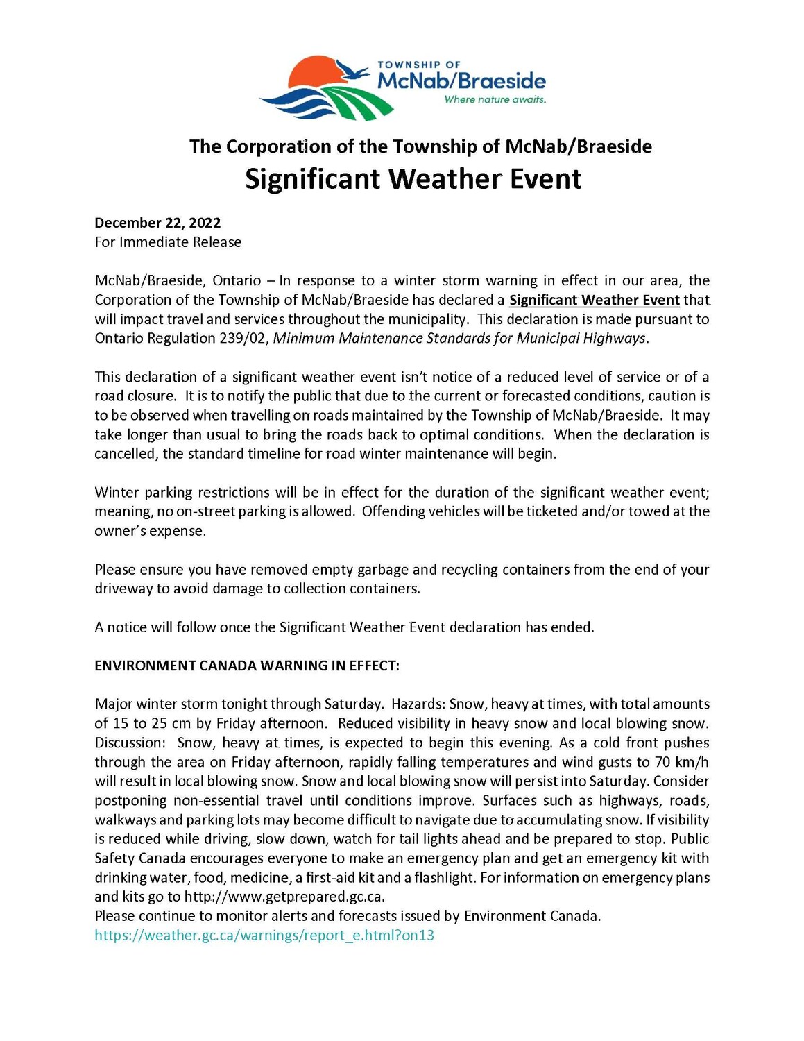 McNab/Braeside, Ontario – In response to a winter storm warning in effect in our area, the Corporation of the Township of McNab/Braeside has declared a Significant Weather Event that will impact travel and services throughout the municipality. This declaration is made pursuant to Ontario Regulation 239/02, Minimum Maintenance Standards for Municipal Highways.
