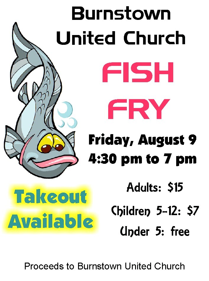 Come to our Fish Fry at Burnstown United Church from 4:30 to 7 PM on Friday, August 9, 2019.