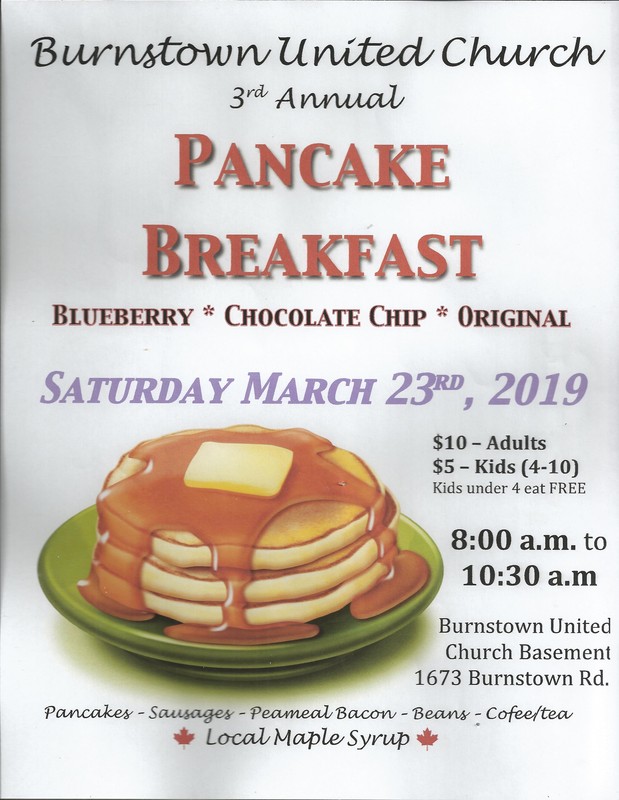 Come to our third annual Pancake Breakfast on Saturday, March 23, from 8 to 10:30 a.m. Three kinds of pancakes, sausages, peameal bacon, beans and local maple syrup. Adults $10, Children (4 to 10) $5 and those under 4 free.