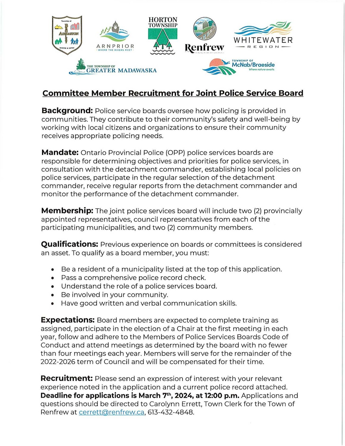 Police record check should be emailed to Carolynn Errett at cerrett@renfrew.ca.