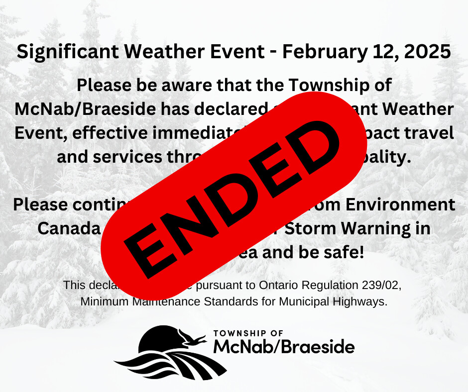 Please be advised that the Significant Weather Event declared by the Township of McNab/Braeside on February 12, 2025, has now ended.