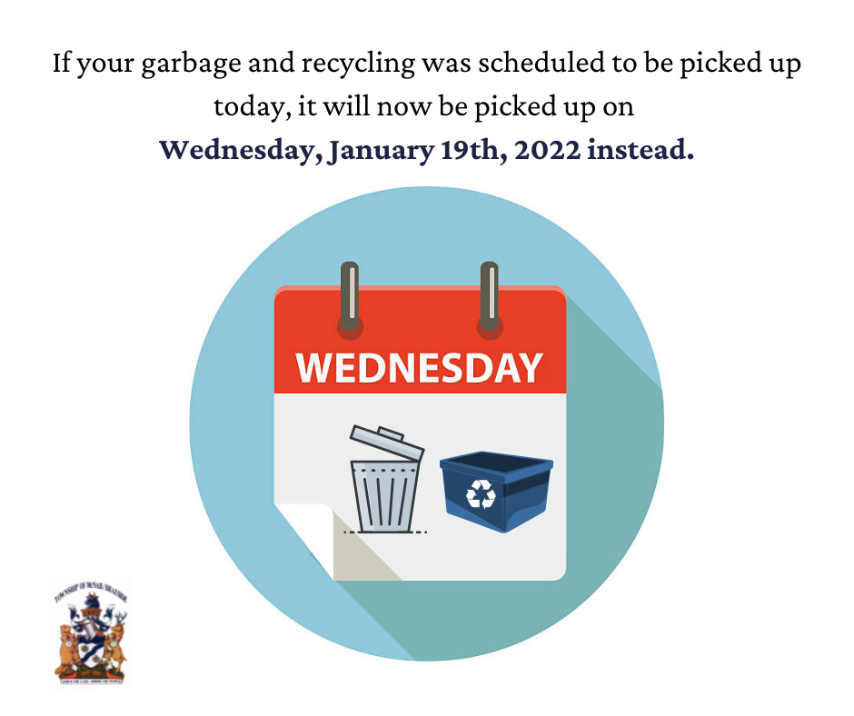 Please be advised that garbage and recycling collection is postponed for January 17, 2022. Please remove your collection items from the roadside at this time. Collection will take place on Wednesday, January 19th, 2022 instead.