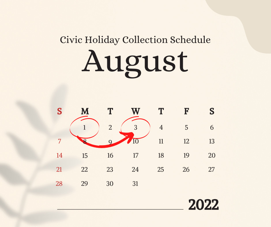 Please be advised that if your regular pick up day should be on Monday, August 1, 2022 (Civic Holiday), it will now take place on Wednesday, August 3, 2022 instead. Only the collection day that falls on the holiday will change. Have a great weekend!
