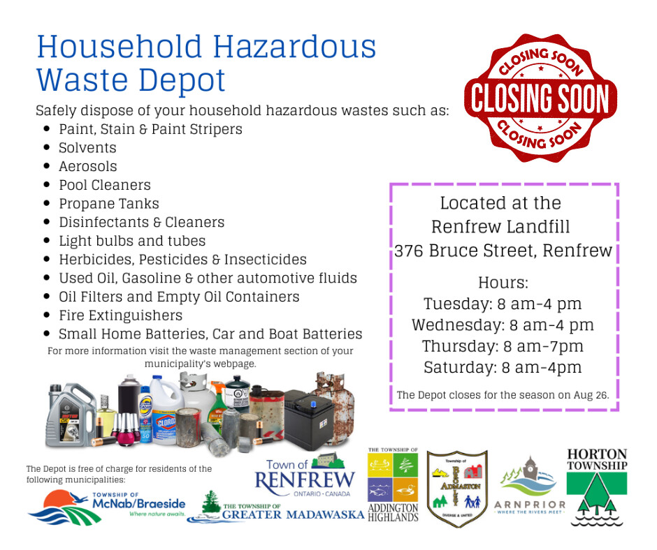 Reminder - The Household Hazardous Waste Depot will be closing for the season on August 26, 2023.