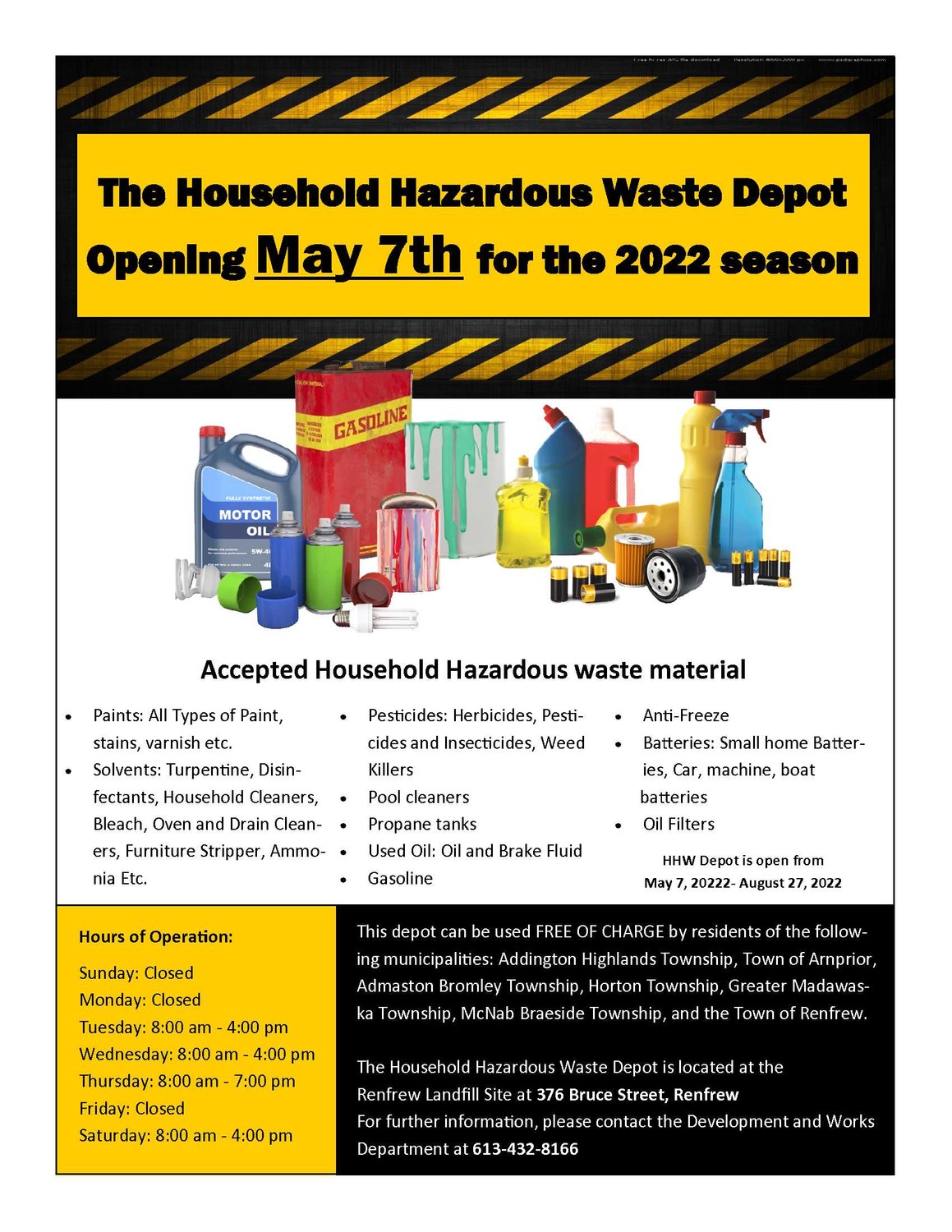 Please be reminded that the Household Hazardous Waste Depot will be closing on August 27, 2022 at the Renfrew Landfill Site, located at 376 Bruce Street.