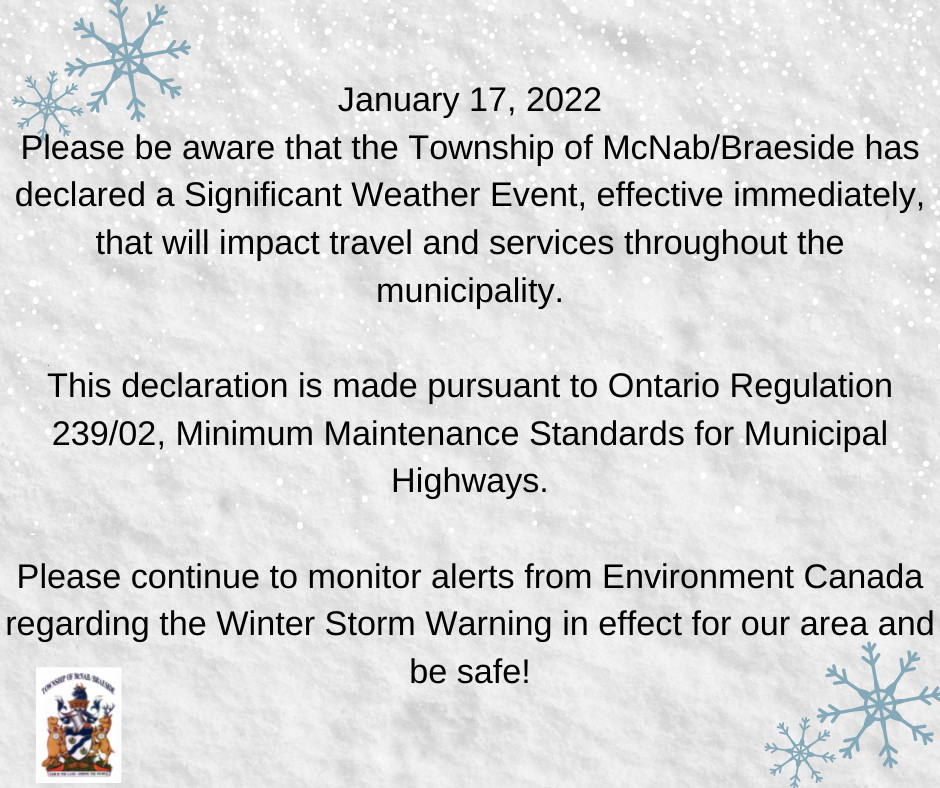 Please be aware that the Township of McNab/Braeside has declared a Significant Weather Event, effective immediately, that will impact travel and services throughout the municipality.
