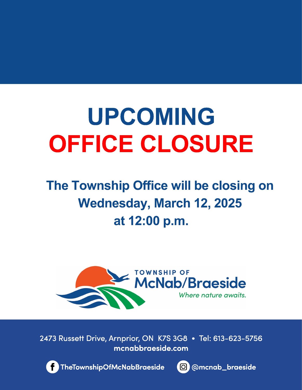 The Township Office will be closed as of 12:00 p.m on Wednesday, March 12, 2025. Regular Office hours will resume on Thursday, March 13th, 2025.