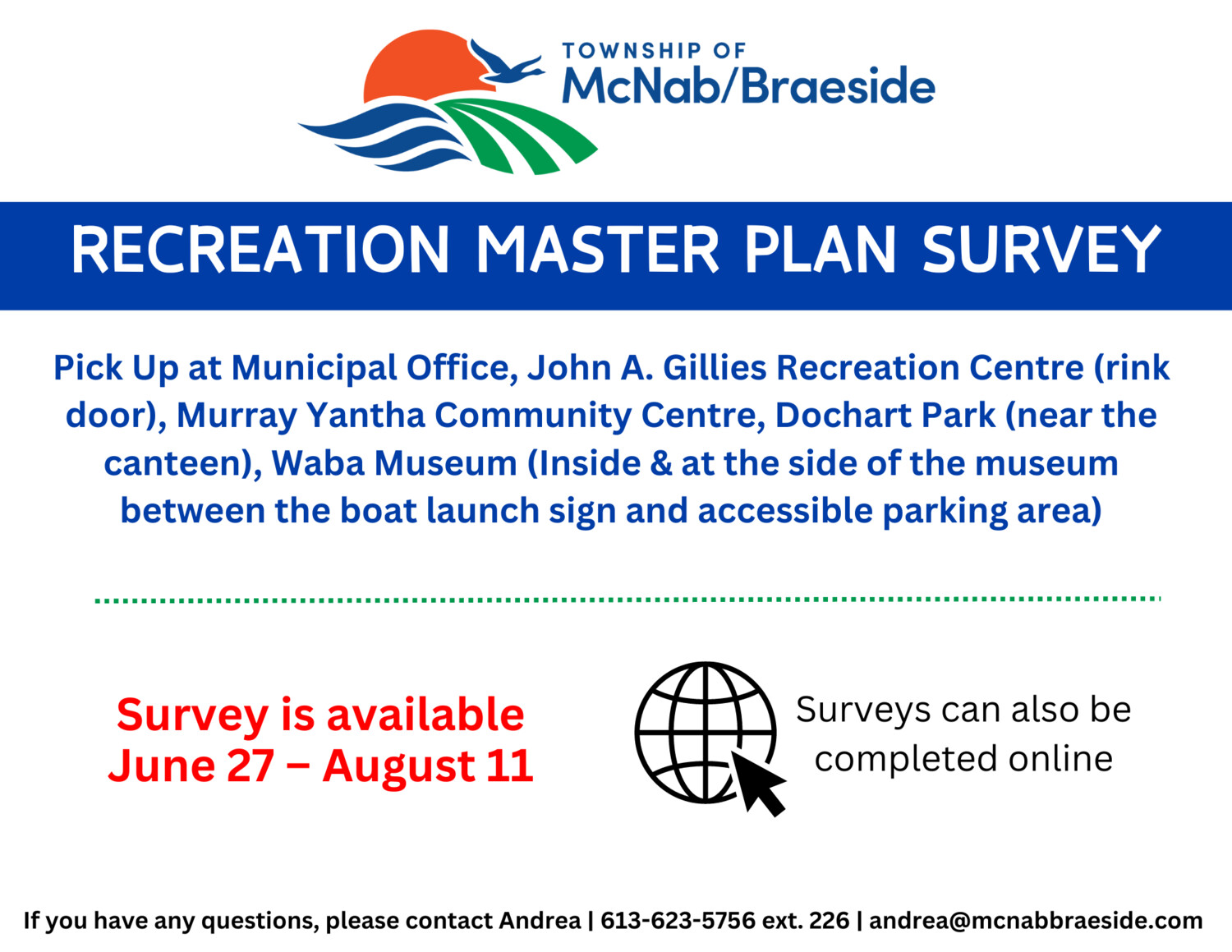 The Township of McNab/Braeside's Recreation Department is embarking on a "Recreation Master Plan Survey". As we aim to enhance the recreation experience for all, your insights and suggestions on potential improvements and innovative amenities are crucial. We view public contributions as a vital component of our planning, ensuring that our parks, recreation facilities and programming reflects the interests and needs of our diverse community. Your suggestions have the power to influence significant decisions about the future of recreation in McNab/Braeside and are instrumental for our future shared success. Your participation is valued as we strive to better understand our residents' experiences and desires regarding parks, properties, programs and events!
