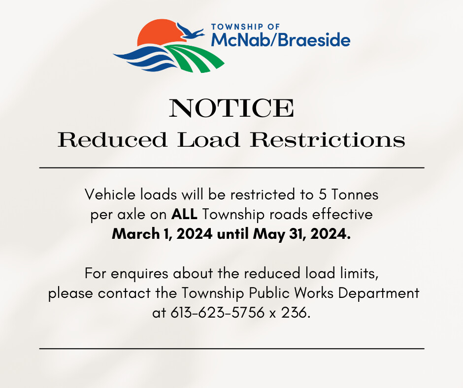 NOTICE is hereby given that restricted vehicle loading regulations, in accordance with the Highway Traffic Act and the Township of McNab/Braeside By-Law No. 2021-23, will be in effect March 1, 2024 until May 31, 2024.
