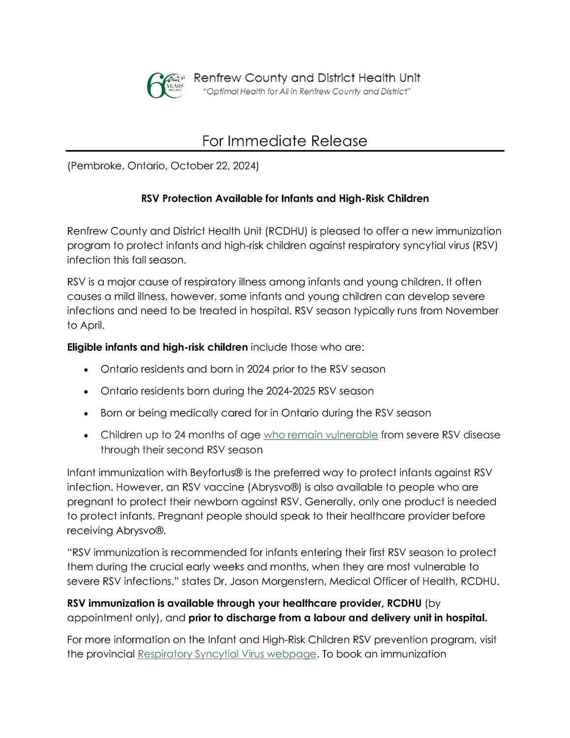 Renfrew County and District Health Unit - RSV Protection Available for Infants and High Risk Children