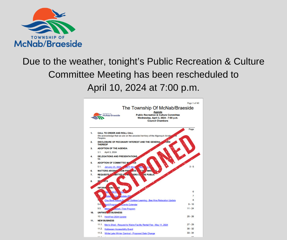 Due to the weather, tonight’s Public Recreation & Culture Committee Meeting has been rescheduled to April 10, 2024 at 7:00 p.m.
