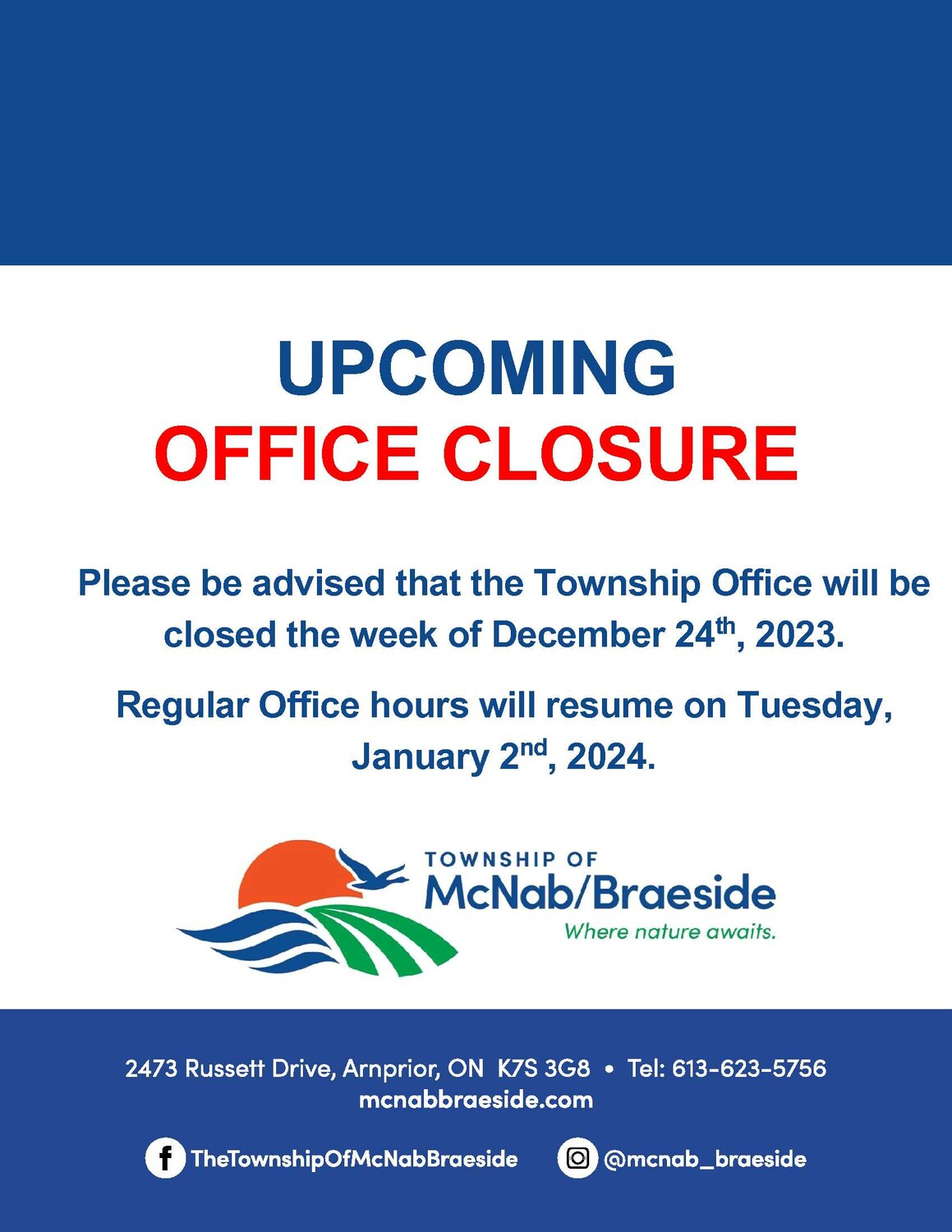 The Township Office will be closed the week of December 24, 2023 and on January 1, 2024. Regular Office hours will resume on Tuesday, January 2, 2024.