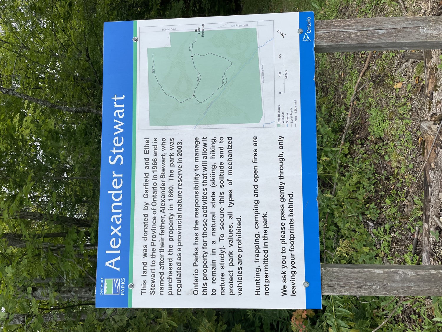 Located at the corner of Mill Ridge Road and Maple Bend Road, Alexander Stewart Provincial Park is a nature reserve that protects an early successional hardwood forest of Maple, American Beech, Basswood and some less common species such as Blue Beech and Bur Oak. The reserve is on a plain of clay silt deposits, left behind when the Champlain Sea retreated from the region.